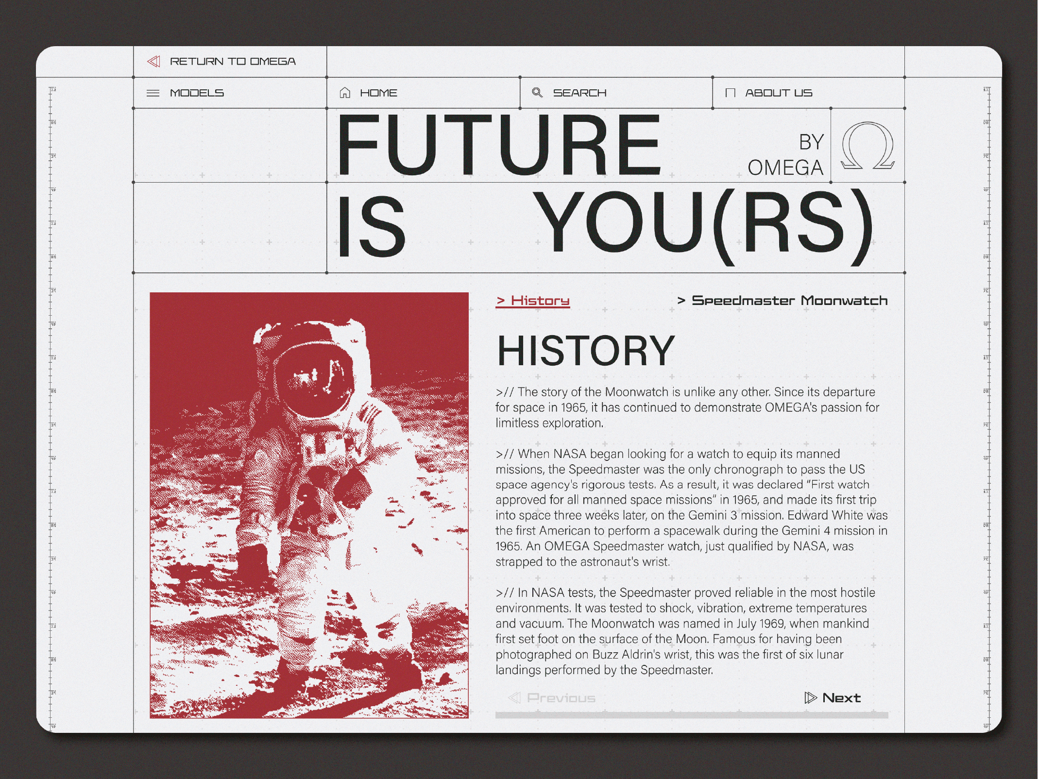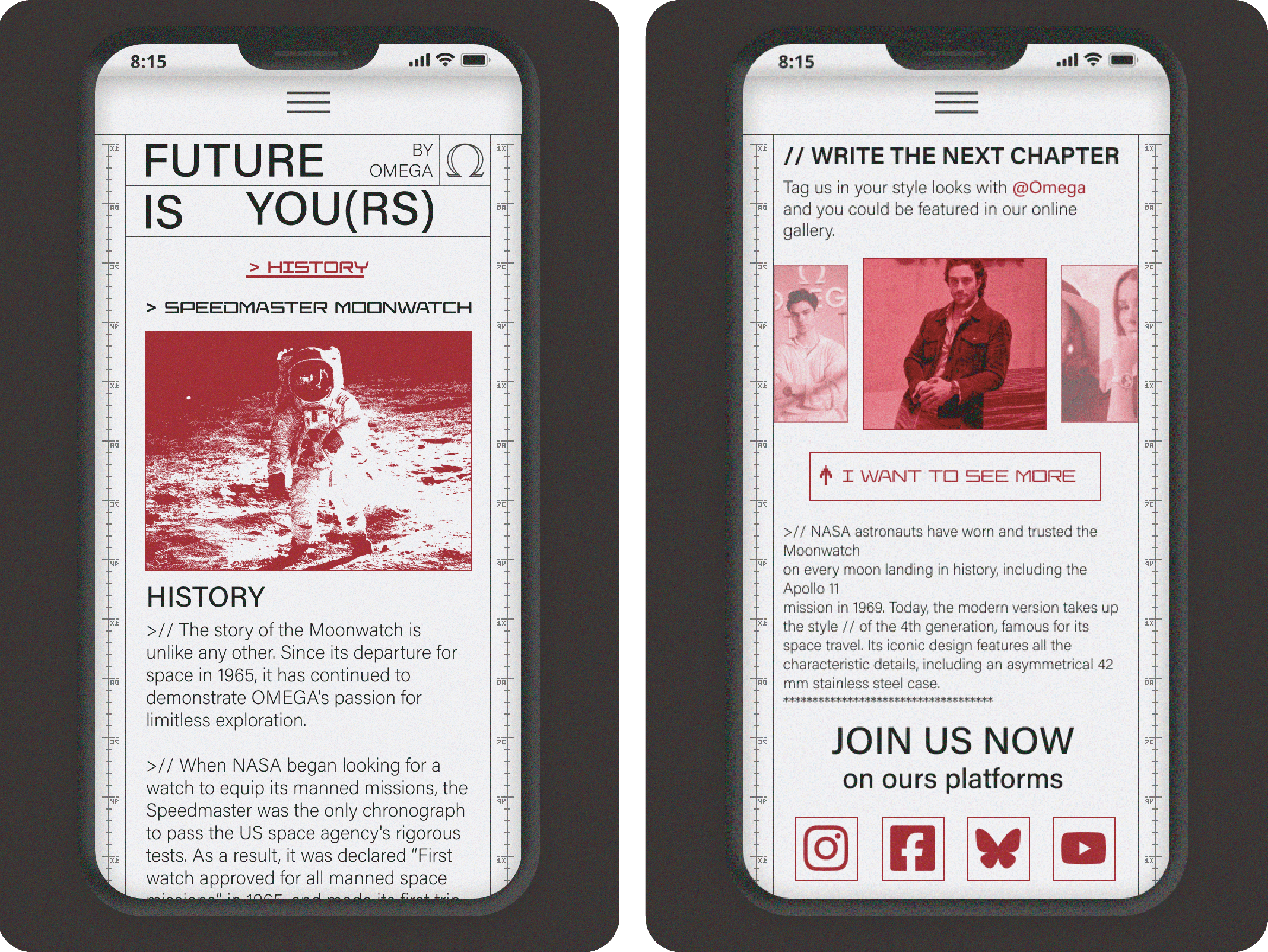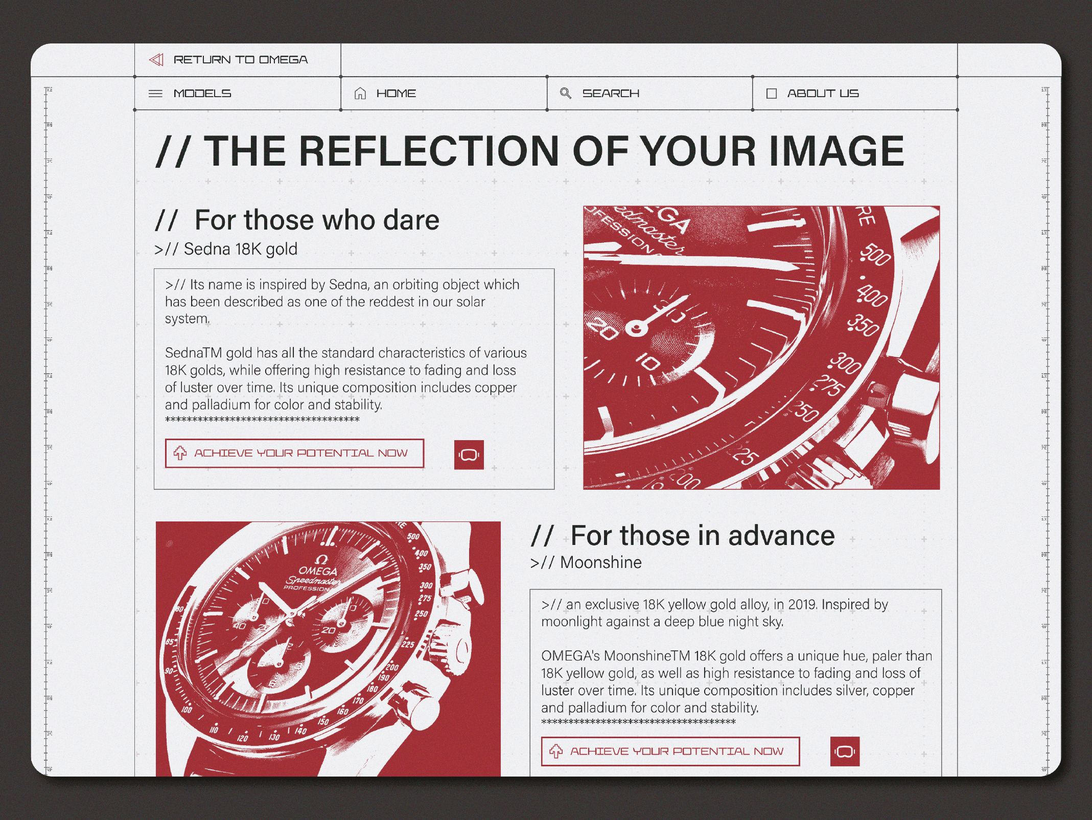 Recentrer OMEGA au coeur de l’innovation, mettre en avant l’experience utilisateur, l’émotion et le parcours full digital et proposer une plateforme d’achat dématérialisé avec un concept graphique fort va pouvoir permettre de susciter de l’émotion.